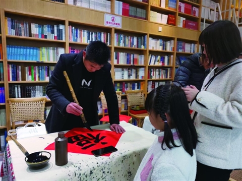 昨天下午,市文化馆古风书社的书法家在定海岛上书店开展泼墨送福迎新春活动,为市民免费写福字、春联,共迎新春佳节。记者 王胜 摄