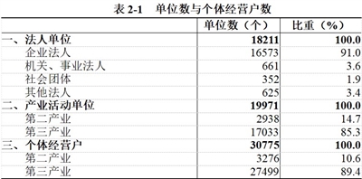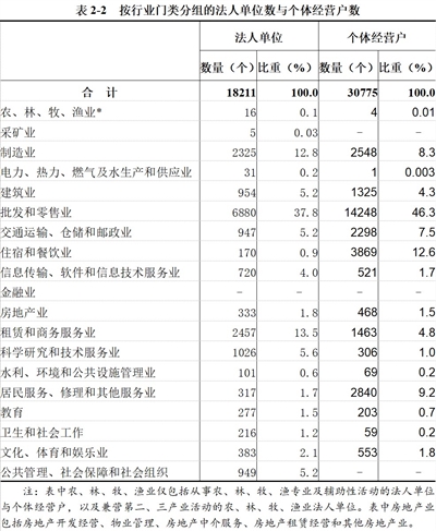 在第二产业和第三产业法人单位中,位居前三位的行业是:批发和零售业6880个,占37.8%;租赁和商务服务业2457个,占13.5%;制造业2325个,占12.8%。在个体经营户中,位居前三位的行业是:批发和零售业14248个,占46.3%;住宿和餐饮业3869个,占12.6%;居民服务、修理和其他服务业2840个,占9.2%(详见表2-2)。