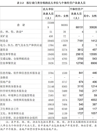 2023年末,全区第二产业和第三产业法人单位从业人员235669人,比2018年末增加9536人,增长4.2%,其中女性从业人员86385人。第二产业从业人员96614人,减少9462人,下降8.9%;第三产业从业人员139004人,增加18994人,增长15.8%。2023年末,全区个体经营户从业人员68143人,其中女性从业人员30820人。