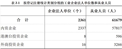 在工业企业法人单位中,内资企业2337个,占99.0%;港澳台投资企业8个,占0.3%;外商投资企业16个,占0.7%。