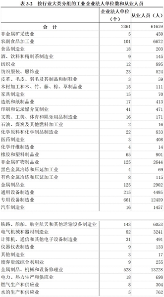 在工业企业法人单位中,采矿业5个,制造业2325个,电力、热力、燃气及水生产和供应业31个,分别占0.2%、98.5%和1.3%。在工业行业大类中,专用设备制造业、金属制品机械和设备修理业和通用设备制造业企业法人单位数位居前三位,分别占28.0%、22.1%和9.1%。