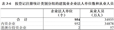 建筑业企业法人单位从业人员中,内资企业34878人,占99.8%;港澳台投资企业57人,占0.2%(详见表3-6)。