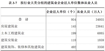 建筑业企业法人单位从业人员中,房屋建筑业占67.7%,土木工程建筑业占17.4%,建筑安装业占5.3%,建筑装饰、装修和其他建筑业占9.6%(详见表3-7)。