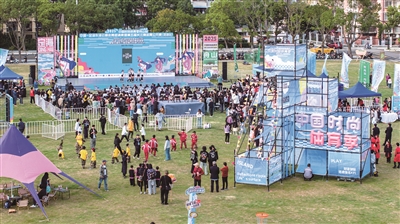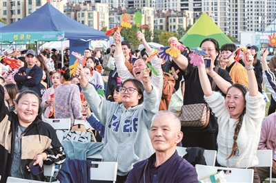 赛场之外,城市嘉年华活动的举行,给东海云廊带来了更多的烟火气。舞台周边的特色美食市集里,摊主们用海岛风味的鱼丸、虾饼,清甜爽口的网红饮品,以及其他特产热情招呼食客;海岛文创摊位前,印有定海风景的明信片、造型别致的贝壳手工艺品等吸引不少市民驻足;在“不倒翁”互动区里,工作人员身着传统服饰,与市民牵手互动。