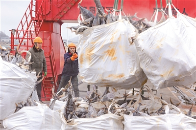 | 舟山国家远洋渔业基地惠群码头工人卸载鱼获 |