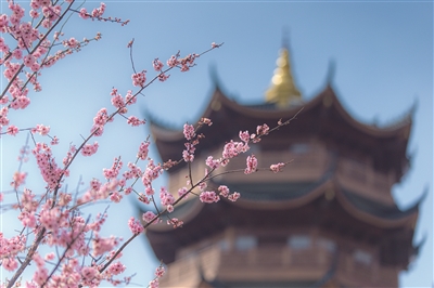 青瓦白墙错落有致,古建与繁花相映成画,一步一景皆是诗意。清风拂过,暗香浮动,粉白花瓣在晴空下轻轻摇曳,为千年古城添上一抹温柔春色,引得市民游人驻足观赏,共赴这场限定的春日之约。