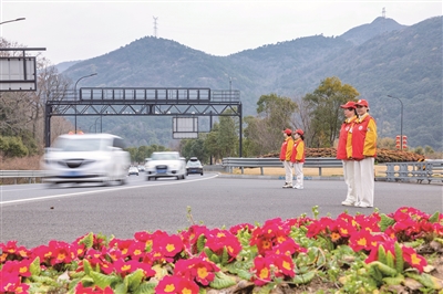 | “志愿红”坚守在位于东西快速路大山岗隧道口的定海区假日旅游志愿服务点 |